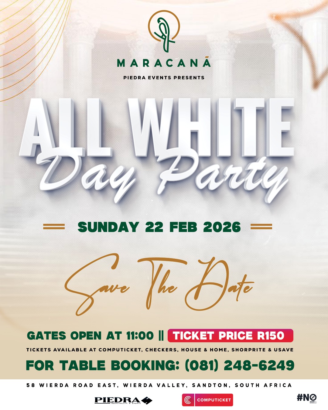 Get ready for the ultimate celebration at the All White Day Party! Join us for a day filled with incredible music, vibrant vibes, and an extravagant atmosphere that you won't want to miss. Mark your calendars for February 22nd, 2026, as we transform Maracanà into the hottest party destination in Sandton!
